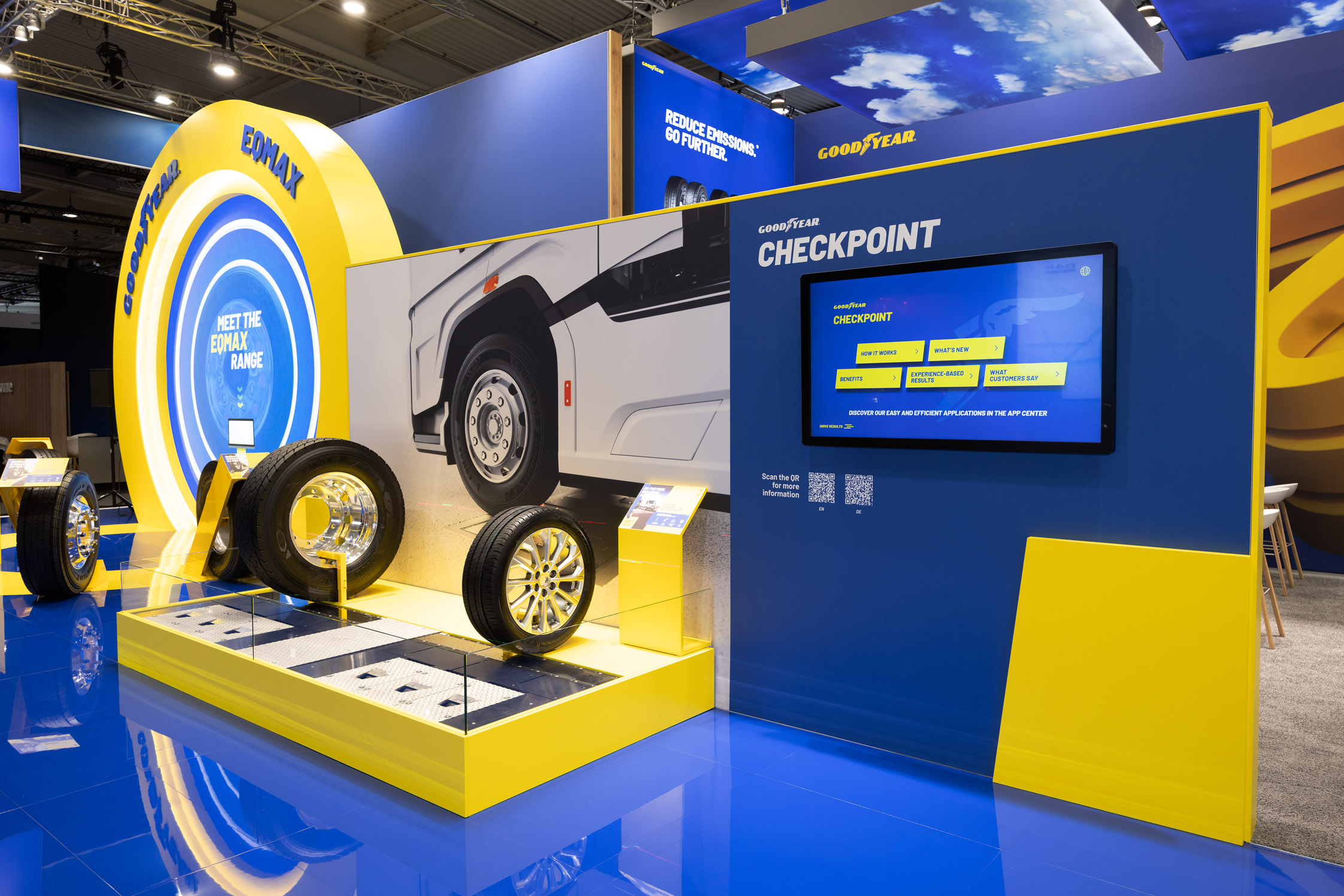 Zentrale Inszenierungselemente wie das überdimensionale Reifenmotiv und die EOMAX-Range bildeten aufmerksamkeitsstarke Ankerpunkte. Digitale Touchpoints und interaktive Screens vermittelten Services wie Checkpoint und DrivePoint anschaulich und praxisnah.