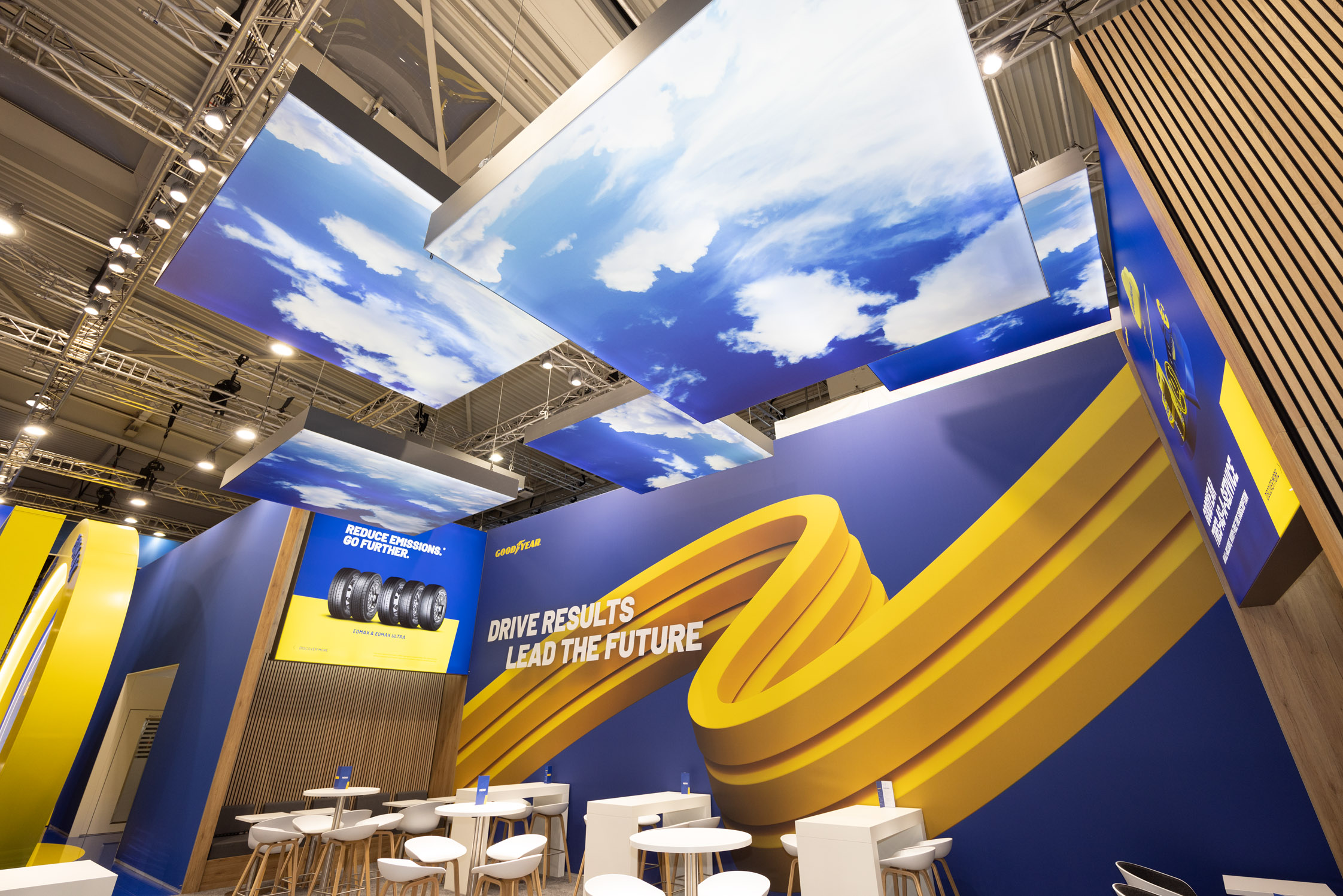 Mit 344 m² präsentierte sich Goodyear auf der IAA Transportation 2024 in Hannover als starke, zukunftsorientierte Marke. Das Standkonzept übersetzte die ikonische Farbwelt in eine prägnante Architektur aus Blau und Gelb – weithin sichtbar durch großzügige Deckenrahmen, leuchtende Key-Visuals und den zwei interaktiven LED-Touchpoints.